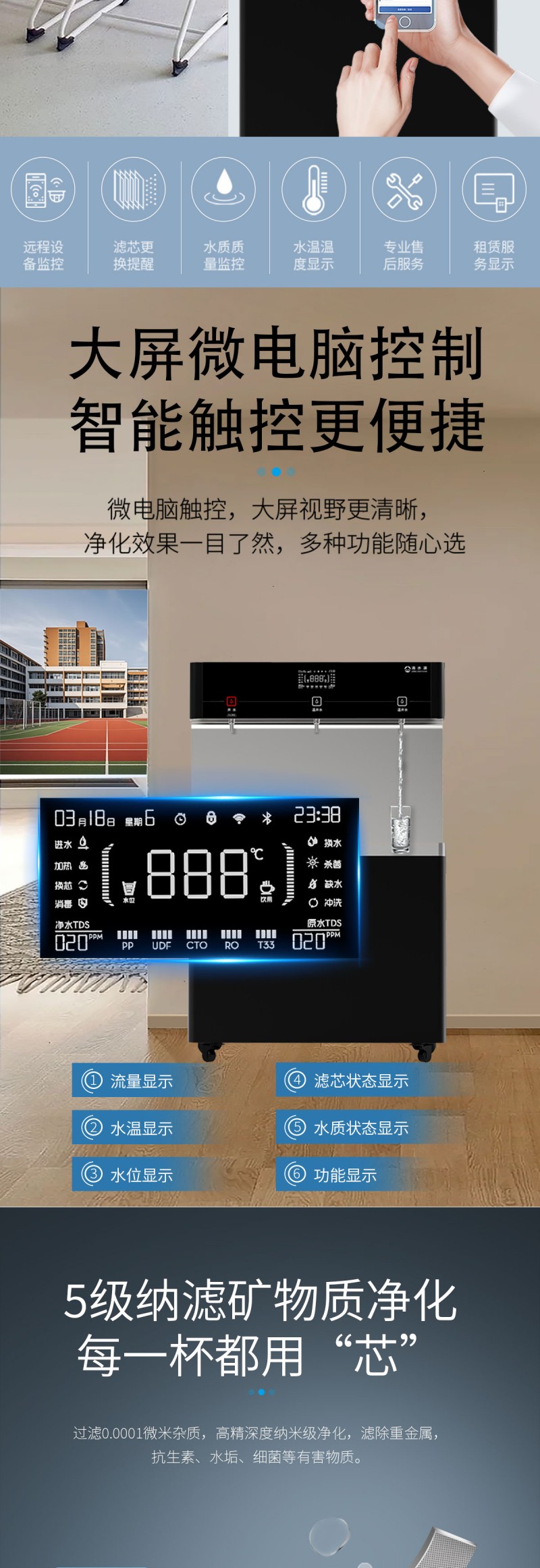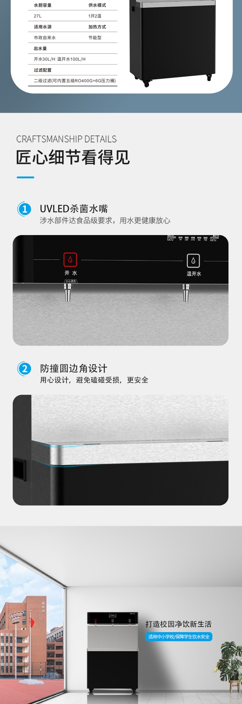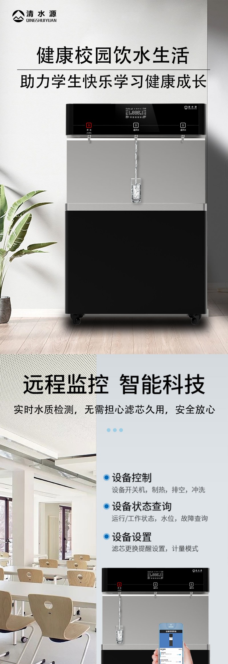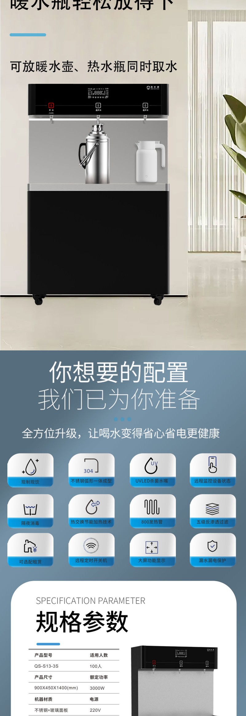 产品尺寸900*450*1400mm,出水量开水30L/H温开水100L/H,电压220V,功率3kw,可供应100人。清水源品牌一开二温节能式直饮机水箱容量27L,该容量水箱可供应100人饮用,可选择配备3级普通过滤。 五级反渗透过滤功能,显示触屏功能配合远程开关及定时功能,使得用户使用感提升,性价比更高。具有100%煮开、高温杀菌系统,确保水质健康、检测无忧。定时开关机、隔夜水定时自动排空、物联网自动报修、水质实时监测、滤芯消耗更新显示、手机远程开关机等特点。零售价为12680元/台。联系电话:13138176786,公司名称:深圳清水源饮水设备有限公司,公司网址http://www.qsy68.com,公司座机服务热线:400-891-5619/0755-82246786。