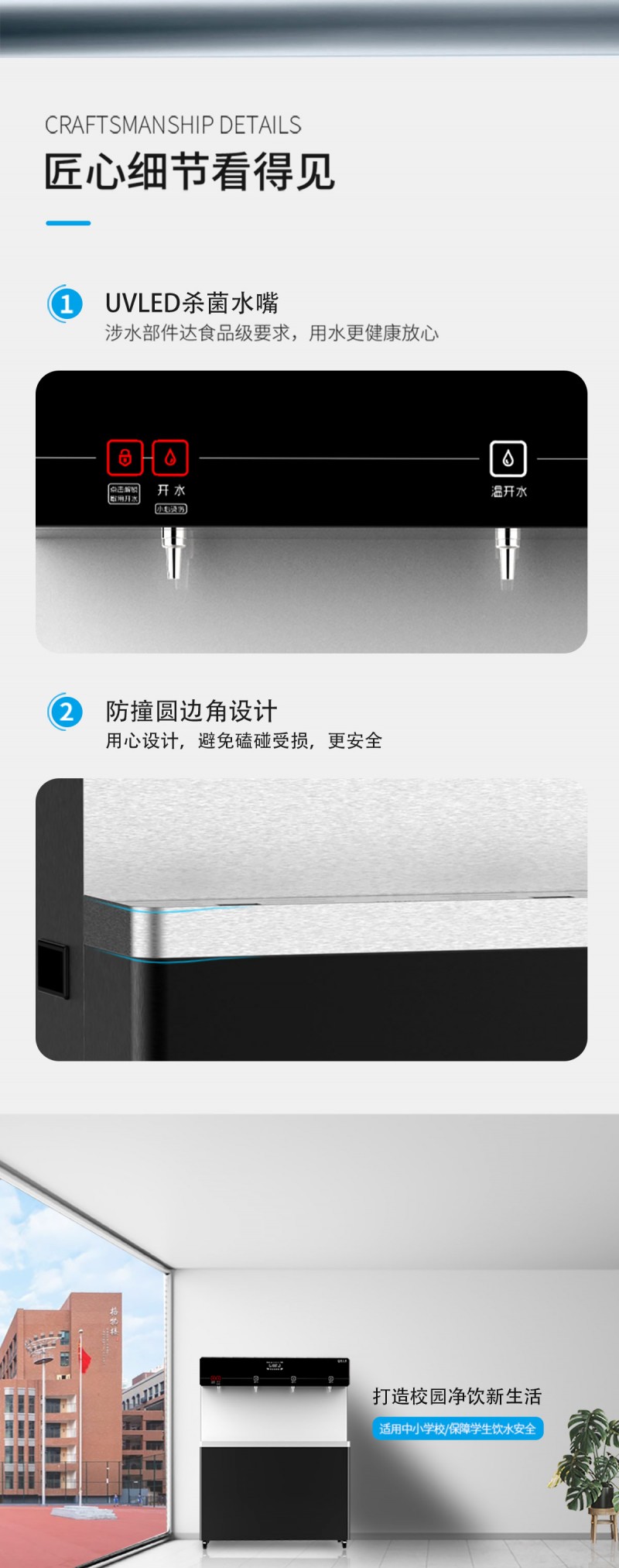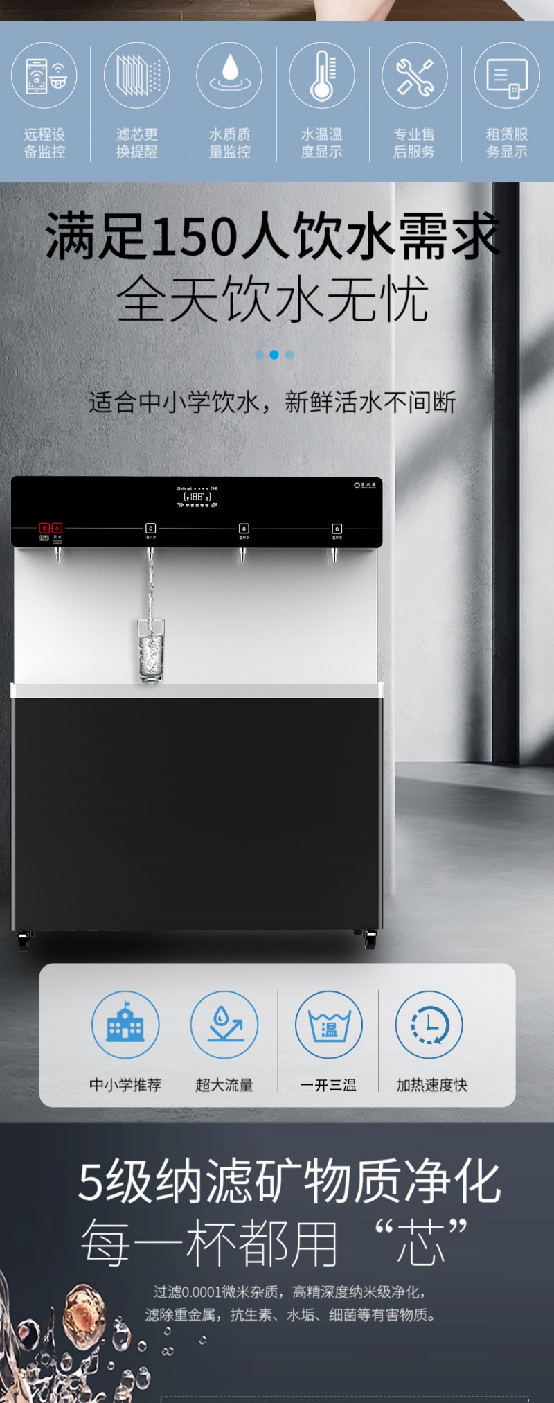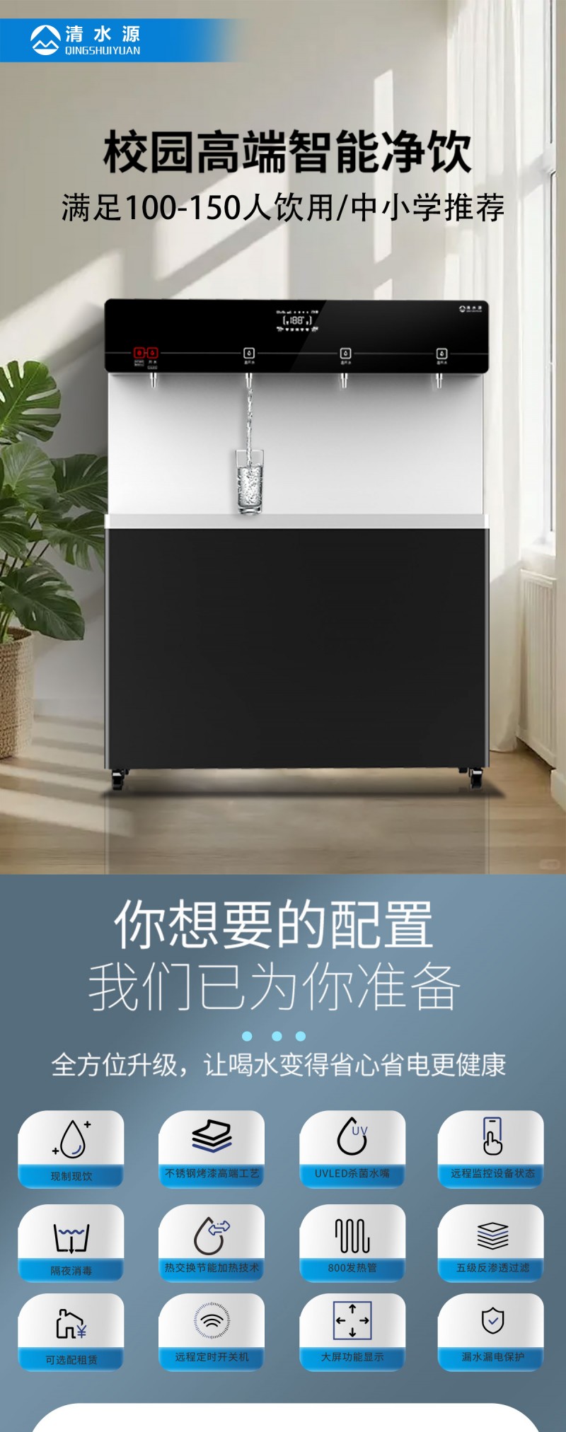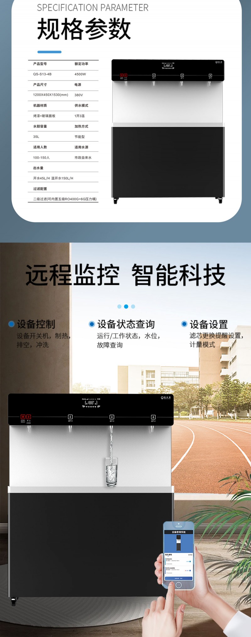 产品尺寸1200*450*1530mm,出水量开水45L/H温开水150L/H,电压380V,功率4.5kw,可供应100-150人。清水源品牌一开三温节能式直饮机,水箱容量35L,该容量水箱可供应150人饮用,可选择配备3级普通过滤。 五级反渗透过滤功能,显示触屏功能配合远程开关及定时功能,使得用户使用感提升,性价比更高。具有100%煮开、高温杀菌系统,确保水质健康、检测无忧。定时开关机、隔夜水定时自动排空、物联网自动报修、水质实时监测、滤芯消耗更新显示、手机远程开关机等特点。零售价为17000元/台。联系电话:13138176786,公司名称:深圳清水源饮水设备有限公司,公司网址http://www.qsy68.com,公司座机服务热线:400-891-5619/0755-82246786。