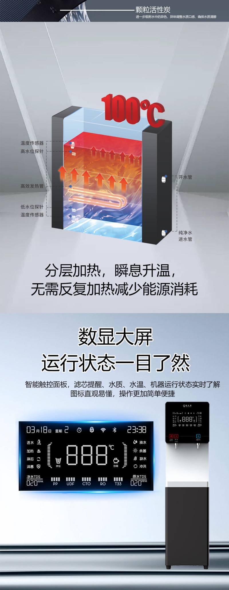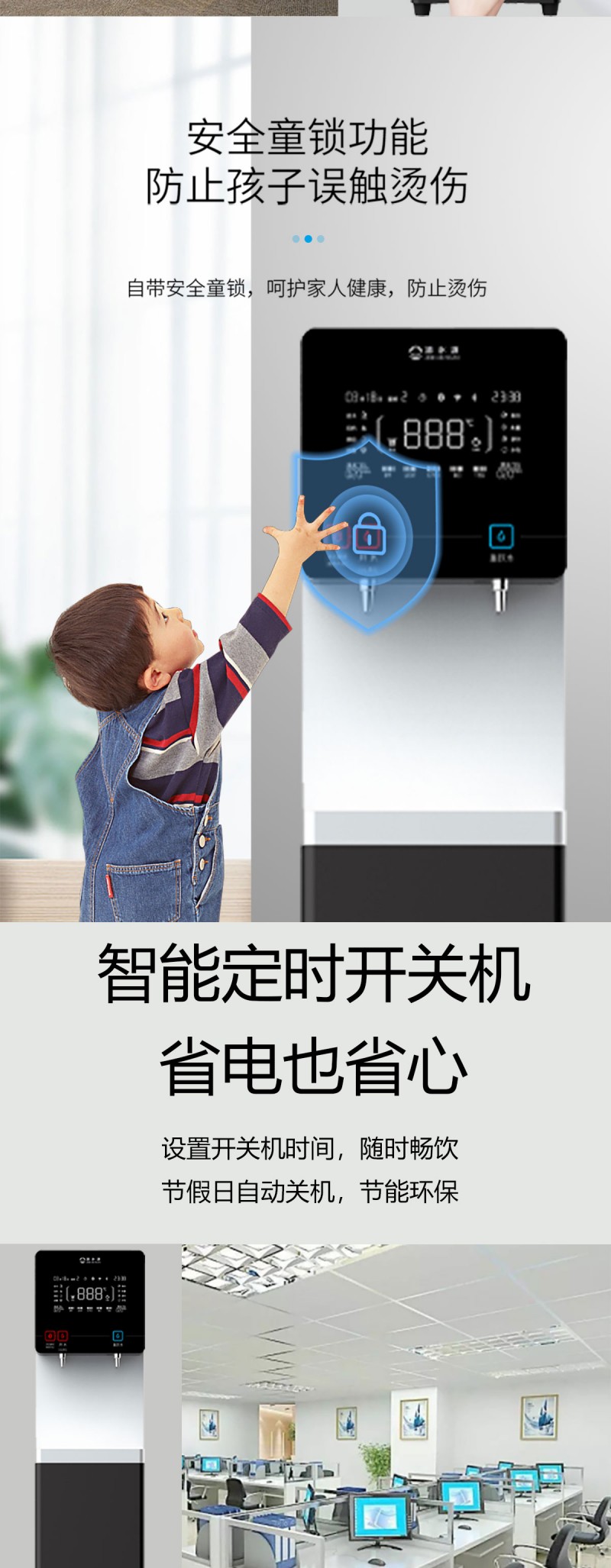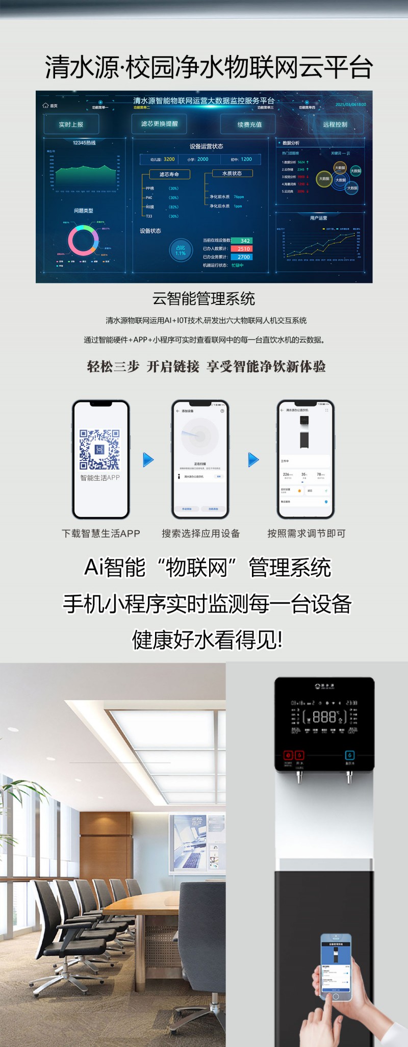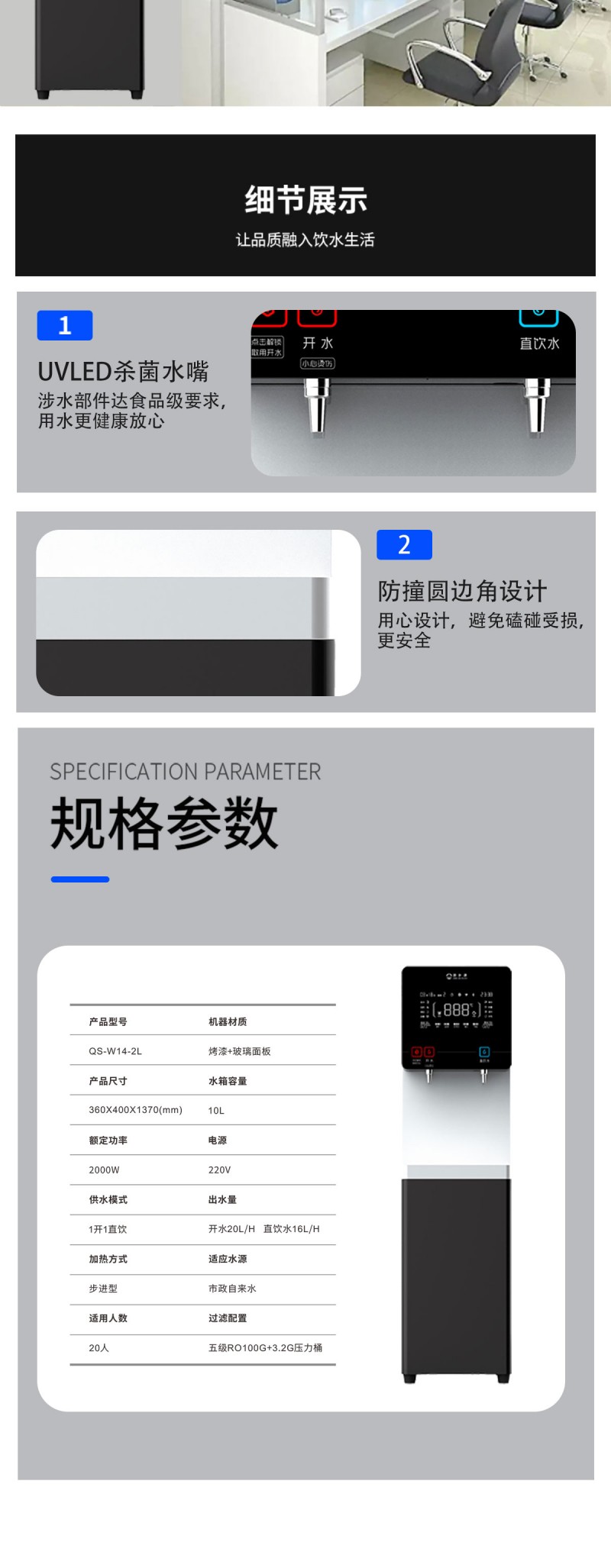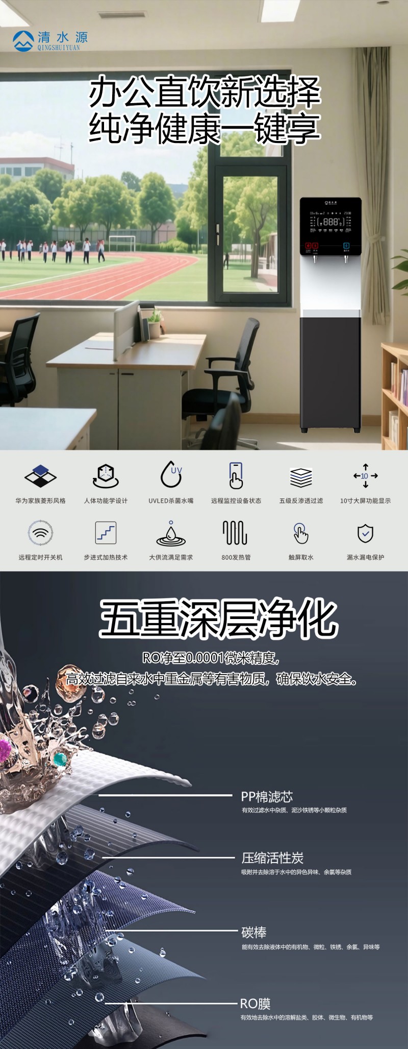 产品尺寸360*400*1370mm,出水量开水20L/H直饮水16L/H,电压220V,功率2kw,可供应20-50人。清水源品牌一开一直饮步进式直饮机,水箱容量10L,该容量水箱可供应50人饮用,可选择配备3级普通过滤。 五级反渗透过滤功能,显示触屏功能配合远程开关及定时功能,使得用户使用感提升,性价比更高。具有100%煮开、高温杀菌系统,确保水质健康、检测无忧。定时开关机、隔夜水定时自动排空、物联网自动报修、水质实时监测、滤芯消耗更新显示、手机远程开关机等特点。零售价为12890元/台。联系电话:13138176786,公司名称:深圳清水源饮水设备有限公司,公司网址http://www.qsy68.com,公司座机服务热线:400-891-5619/0755-82246786。