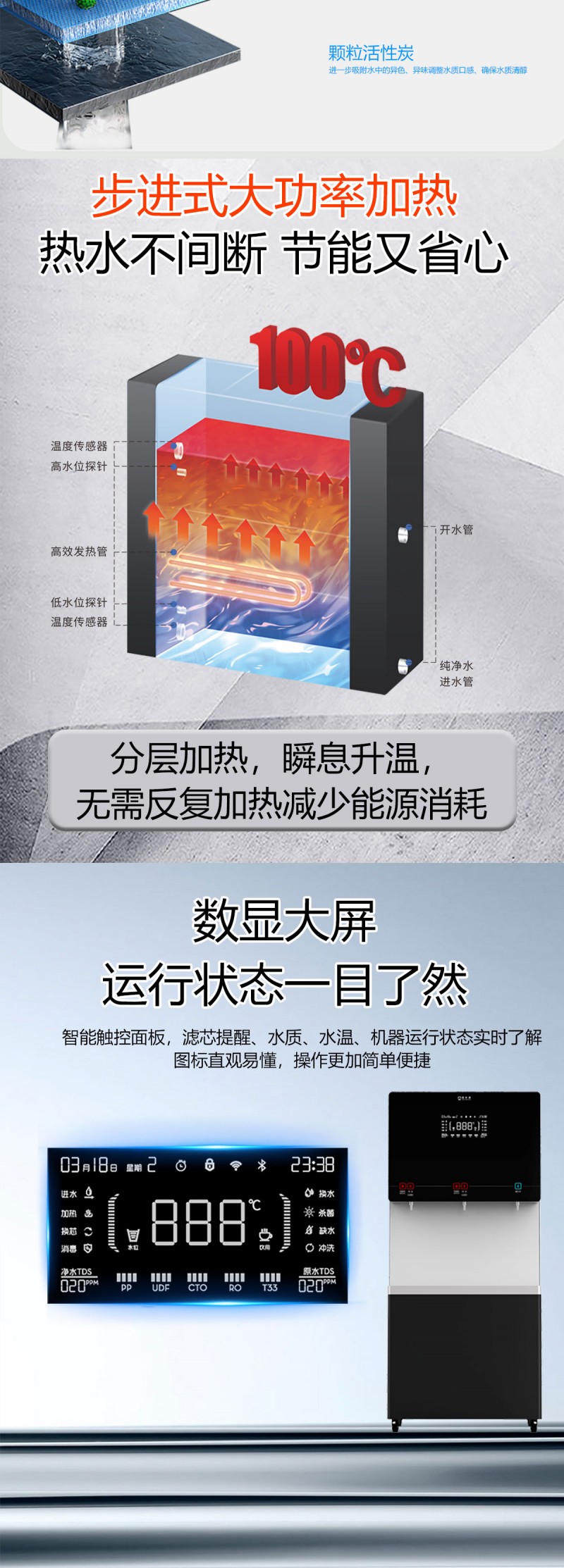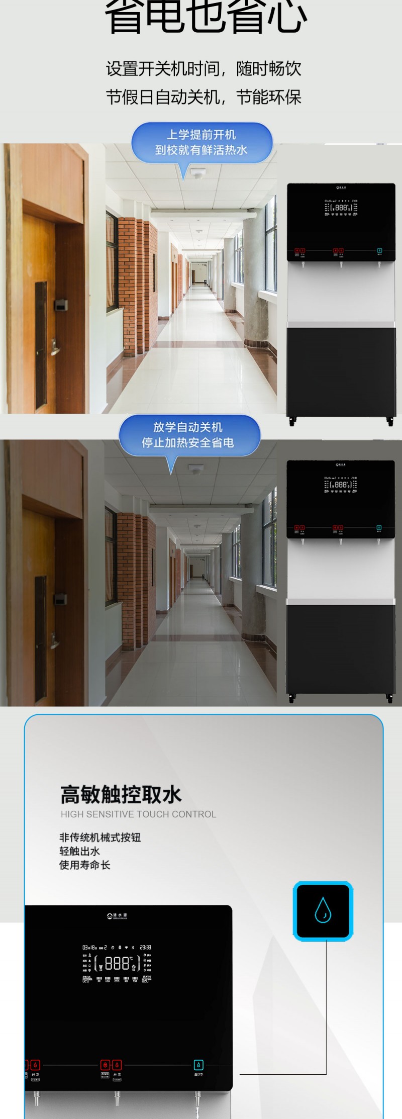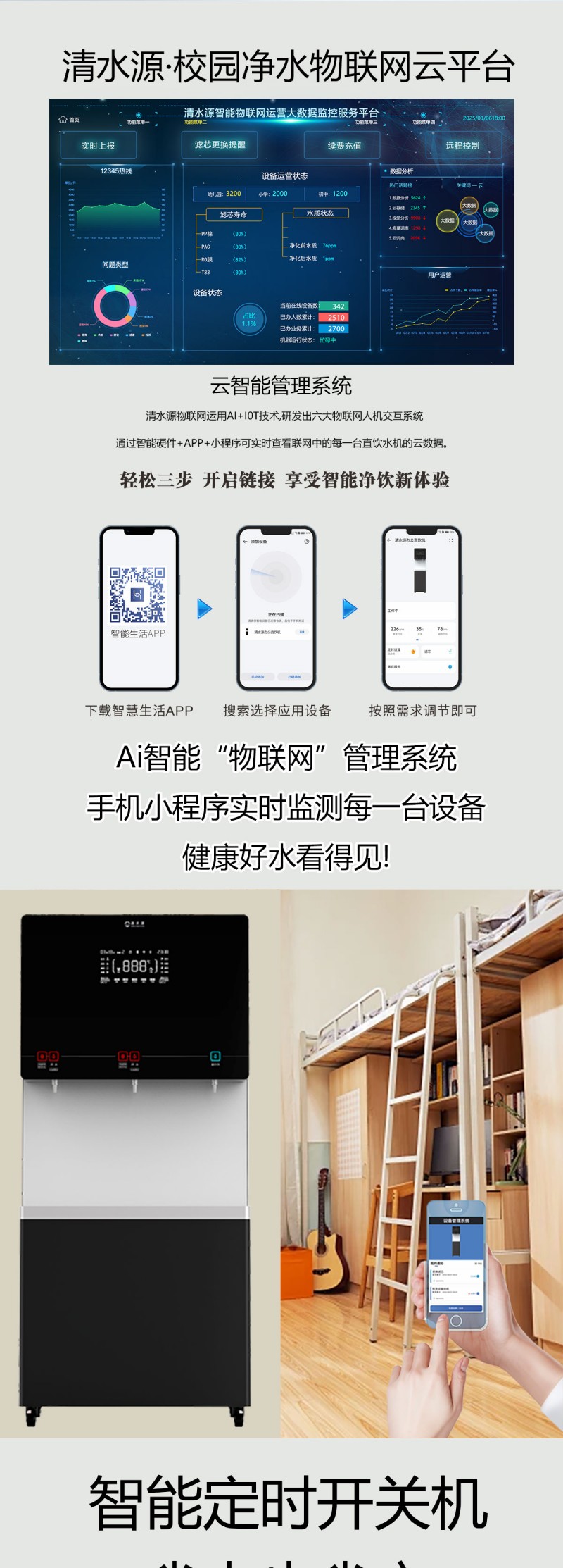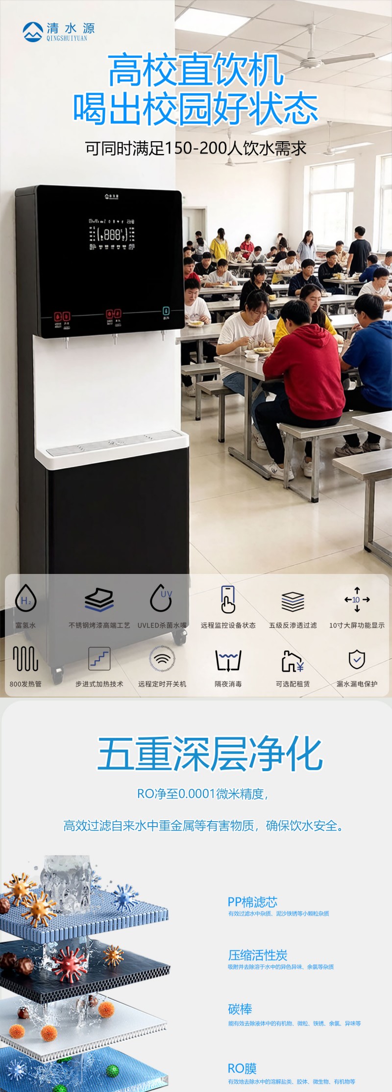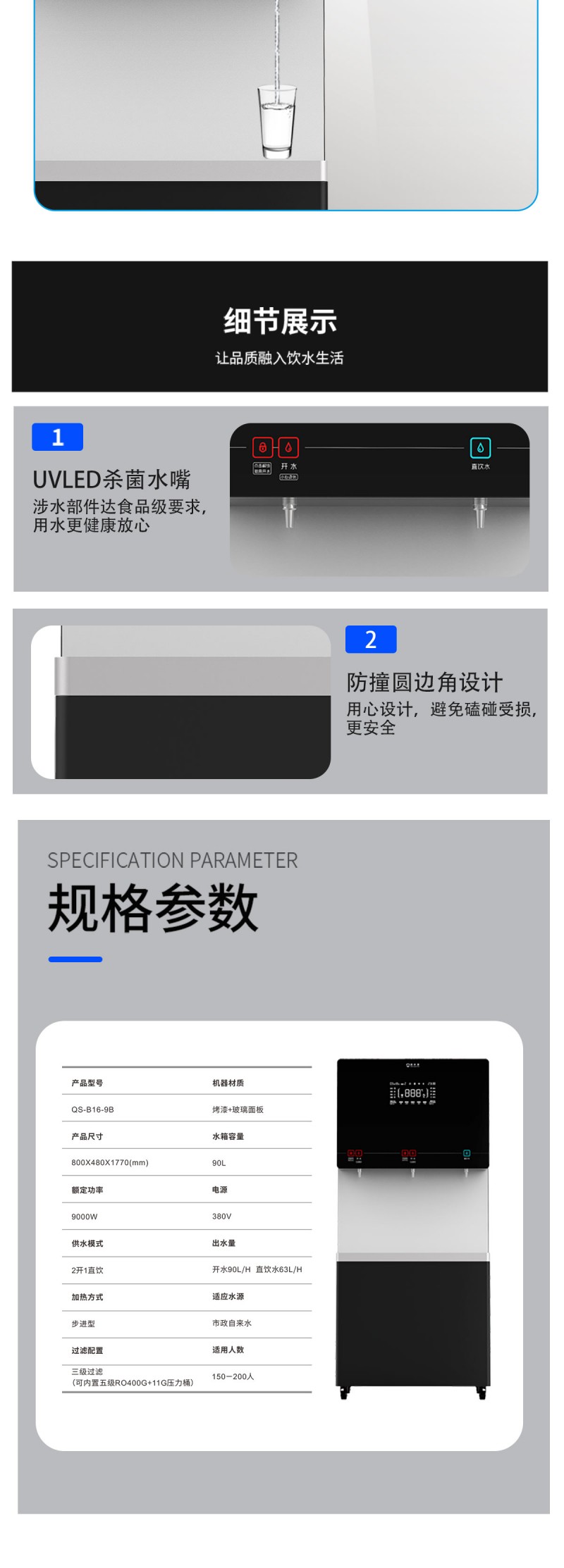 产品尺寸800*480*1770mm,出水量开水90L/H直饮水63L/H,电压380V,功率9kw,可供应150-200人。清水源品牌二开一直饮步进式直饮机,水箱容量90L,该容量水箱可供应200人饮用。可选择配备3级普通过滤。 五级反渗透过滤功能,显示触屏功能配合远程开关及定时功能,使得用户使用感提升,性价比更高。 配有UVLED杀菌水嘴,严防守住最后一道防线,使得水质更加的安全,用户更安心。具有100%煮开、高温杀菌系统,确保水质健康、检测无忧。定时开关机、隔夜水定时自动排空、物联网自动报修、水质实时监测、滤芯消耗更新显示、手机远程开关机等特点。零售价为16380元/台。联系电话:13138176786,公司名称:深圳清水源饮水设备有限公司,公司网址http://www.qsy68.com,公司座机服务热线:400-891-5619/0755-82246786。