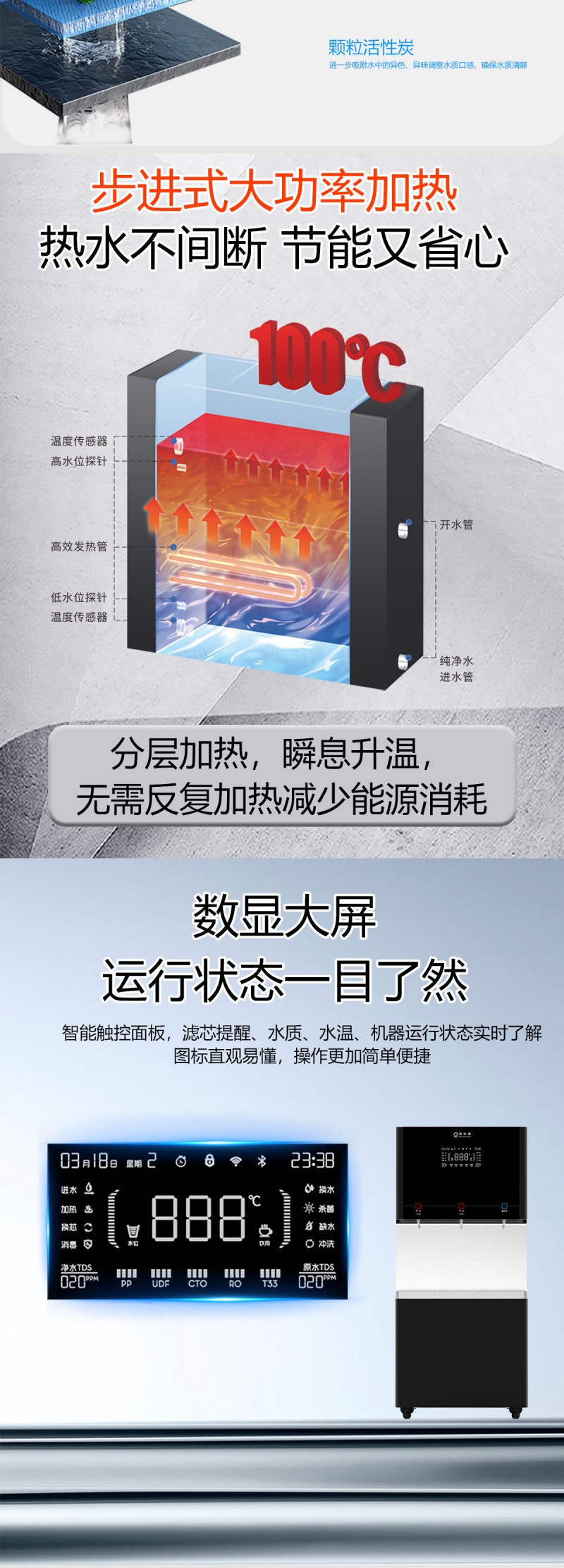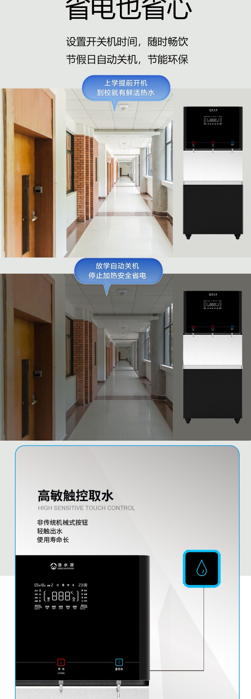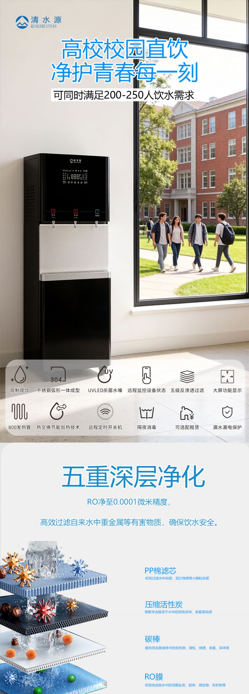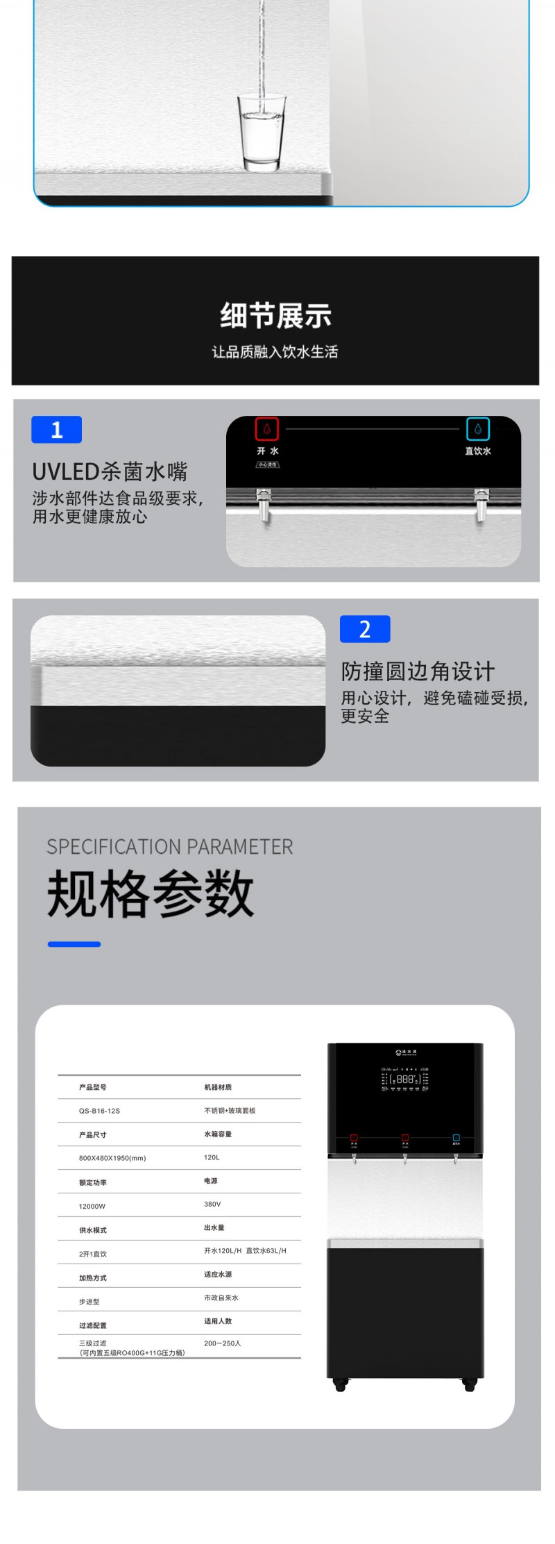 产品尺寸800*480*1950mm,出水量开水120L/H直饮水63L/H,电压380V,功率12kw,可供应200-250人。清水源品牌二开一直饮水步进式直饮机,水箱容量120L,该容量水箱可供应250人饮用。可选择配备3级普通过滤。 五级反渗透过滤功能,显示触屏功能配合远程开关及定时功能,使得用户使用感提升,性价比更高。 配有UVLED杀菌水嘴,严防守住最后一道防线,使得水质更加的安全,用户更安心。 具有100%煮开、高温杀菌系统,确保水质健康、检测无忧。定时开关机、隔夜水定时自动排空、物联网自动报修、水质实时监测、滤芯消耗更新显示、手机远程开关机等特点。零售价为19960元/台。联系电话:13138176786,公司名称:深圳清水源饮水设备有限公司,公司网址http://www.qsy68.com,公司座机服务热线:400-891-5619/0755-82246786。